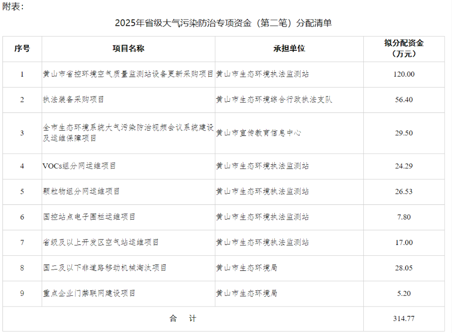 根据省财政厅 省生态环境厅《关于提前下达2025年省级大气污染防治专项资金的通知》(皖财资环〔2024〕1307号)和《关于下达2025年第二批省级大气污染防治专项资金的通知》(皖财资环〔2025〕285号),市财政局、市生态环境局拟将省下达我市2025年省级大气污染防治专项资金(第二笔)314.77万元用于9个项目实施(清单附后)。为体现公开、公正、公平的原则,现予以公示。