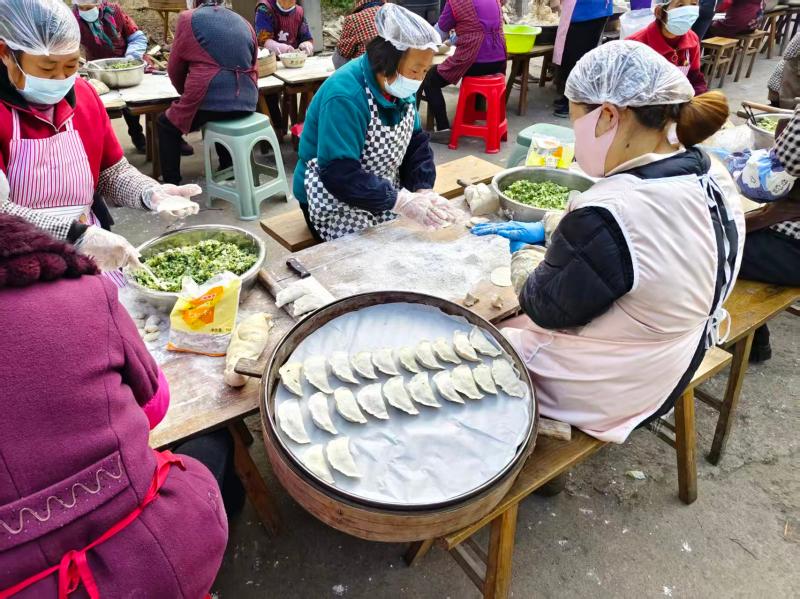 活动当天,高岔祠堂门口的广场上摆起了长长的桌子,乡村干部共同维护现场秩序,全村老少分工协作,大家一边制作,一边交流着经验和心得,欢声笑语回荡在整个广场。经“揉、拍、捏、蒸”四道工序,蒸屉掀开时白雾缭绕,清香扑鼻。不多时,大家便排起长长的队伍,领取米饺进行品尝,更有周边其他乡镇的村民以及游客慕名前来感受乡村美食的独特魅力。与此同时,还有志愿者给行动不便的老人送米饺上门,让大家都能够品尝上美味的米饺。