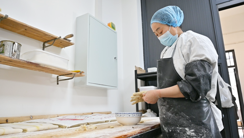 在金字牌镇一家徽味烧饼作坊里,制饼师傅汪富丽正专注地制作传统徽州烧饼。将头天晚上发好的面团搓成长条,揪成大小均匀的剂子,掌心轻轻一压,便成了圆润的面皮。紧接着放入提前制好的梅干菜扣肉馅,将面皮细细收拢、捏紧封口,再轻轻按扁,一个圆墩墩的饼坯便成型了。