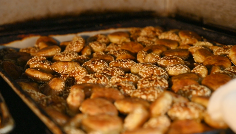 烘烤是个需要耐心和经验的环节,其间需不时取出翻面、调整形态,才能确保受热均匀、外形饱满。当炉内飘出的香气由面香逐渐转为焦香时,烧饼便烤好了。刚出炉的烧饼通体金黄,边缘微焦,芝麻粒粒分明,香气扑鼻。