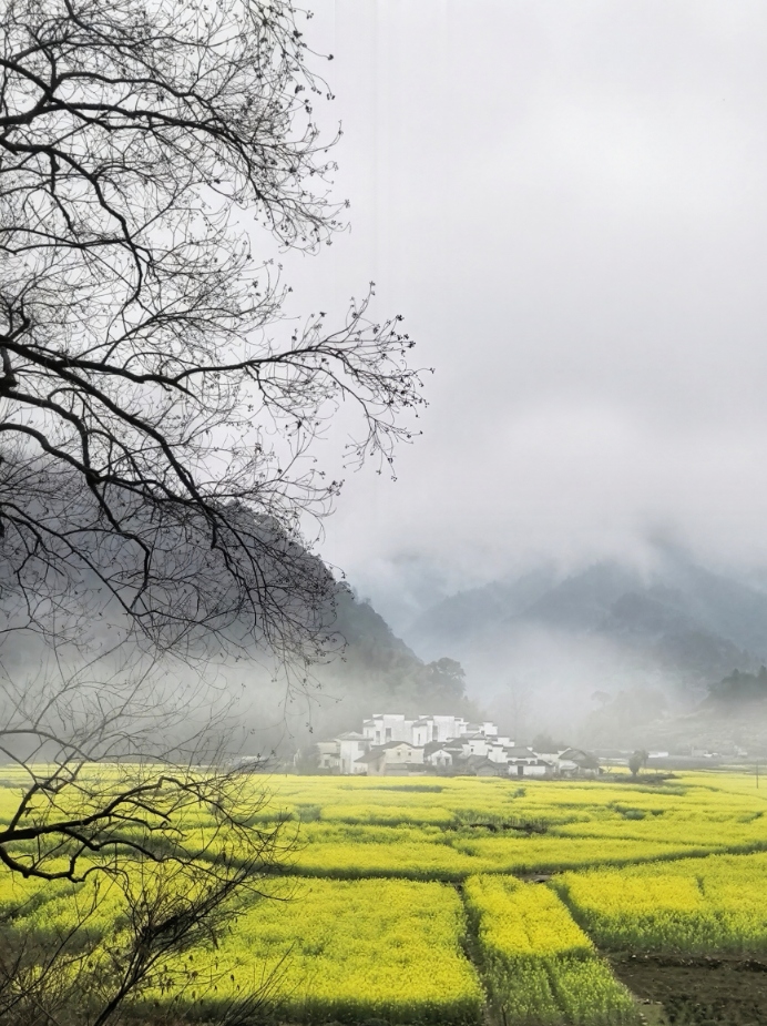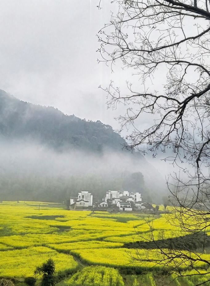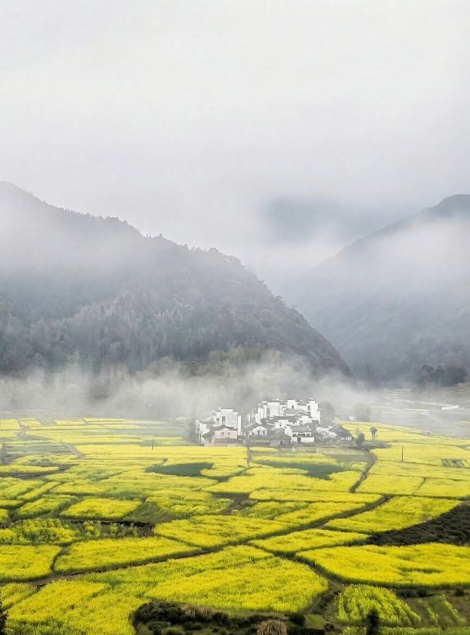 板桥乡地处五龙山脉深处,是中国重要农业文化遗产休宁山泉流水养鱼系统的核心区,生态环境绝佳。盛开的油菜花海位于板桥乡呈村,百余亩油菜花田错落分布,金黄的花朵在春风中摇曳,层层叠叠铺满田间。花海之中,十几户徽派民居错落有致,白墙黑瓦在云雾掩映下若隐若现,宛如世外桃源。呈村花海独具特色,成为摄影爱好者的取景胜地。
