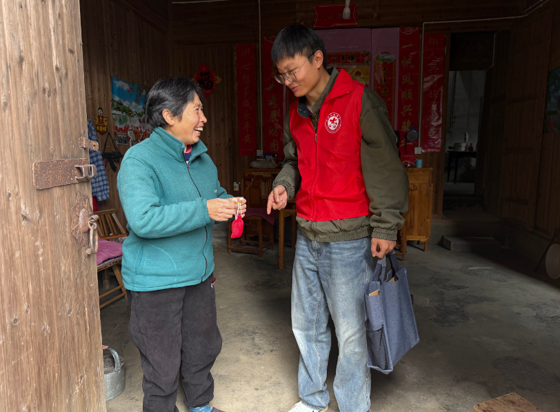 香囊制作环节结束后,璜尖乡的乡间小路上多了许多忙碌的身影——乡、村两级干部与志愿者们组成的“送暖小队”,按照各村老年人分布情况分组行动,由村干部带头引路,确保“不漏一户、不落一人”。敲开老人家的门,志愿者们第一时间递上香囊,轻声道上“重阳节快乐”的祝福。随后,大家还会坐下来与老人简单聊聊家常,询问近期生活状况与身体健康情况,反复叮嘱秋冬季节气温变化大,要及时添衣保暖、注意用火用电安全。接过香囊的老人们脸上满是笑容,有的还凑近闻了闻香囊的香气,连连称赞“这个节过得真舒心!”