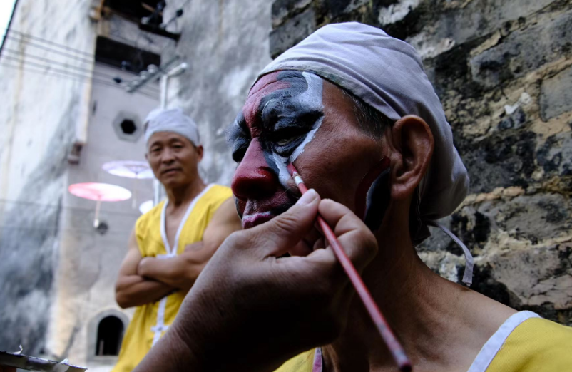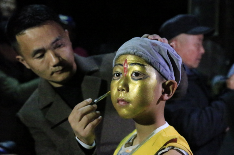 每逢闰年元宵,叶村的洪氏宗祠内,画师们忙着为“罗汉班”成员“开脸”,收到“罗汉帖”的表演者带着专属脸谱登台,在锣鼓声中叠出“六柱牌坊”等经典造型;中村的狮灯队伍则在夜幕中穿行,脸谱随灯光流转,与鞭炮声、欢呼声交织成民俗盛宴。这些脸谱从颜料调制到图案勾勒,全凭口传心授的技艺,既延续着“驱邪消灾”“保平安”的古老寓意,也凝聚着村民的乡愁记忆。