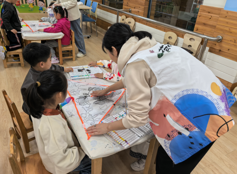 社区工作人员准备了空白风筝,为儿童分发风筝配件、画笔等,鼓励孩子们小组合作,在空白风筝上涂上自己喜欢的颜色。孩子们大胆执笔,有的创意添加图案,有的勾勒灵动线条,有的涂抹缤纷色彩,将心中的畅想一一呈现在风筝上。社区工作人员启发孩子自主构思、调色、绘画,现场不时传来欢声笑语,“家校社”联动的温情在创作中悄然升温。