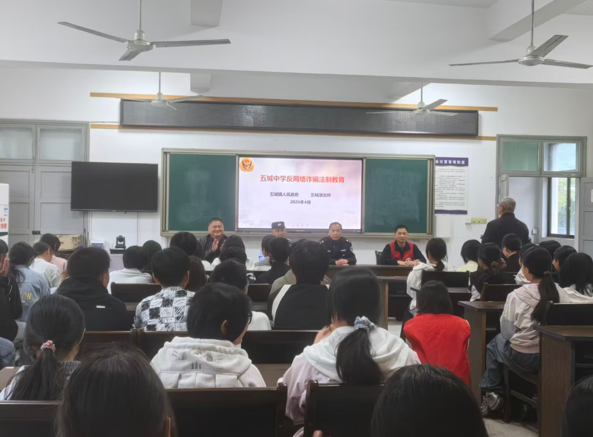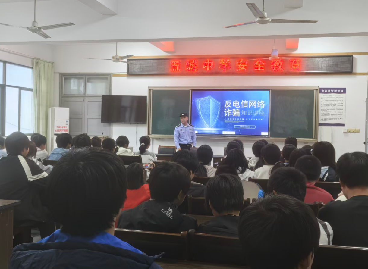 为全面落实全员育人导师制工作要求,将法治安全教育融入导师日常育人全过程,做实学生安全关爱与思想引领,建设平安法治校园,2026年4月28日下午,休宁县五城中学联合五城镇派出所、五城镇司法所,开展防范电信网络诈骗、守护国家安全专题法治教育活动。