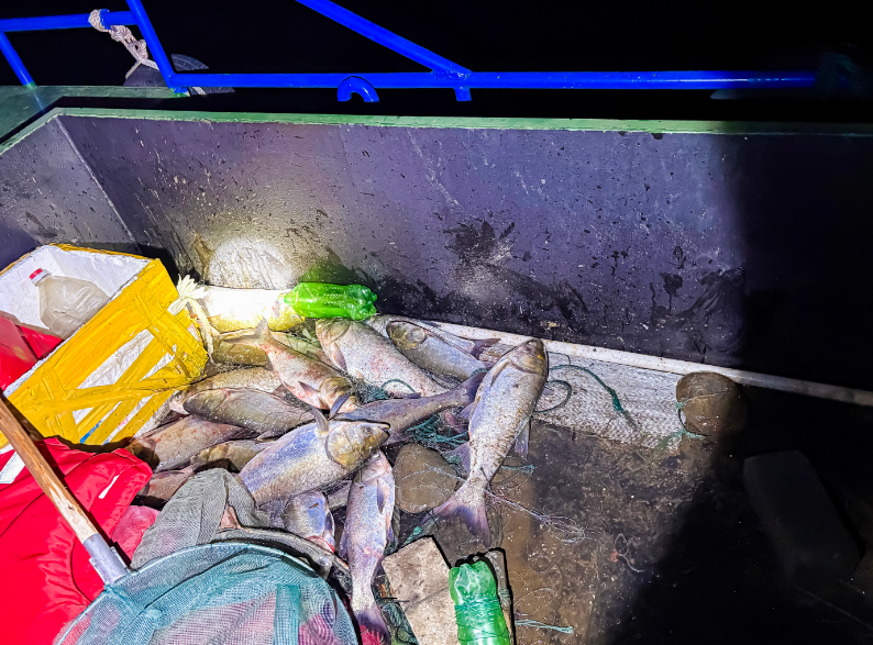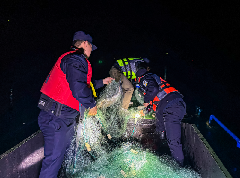 3月21日晚,歙县街口镇联合派出所、渔政等部门及“水上卫士”护渔队,在新安江重点水域开展突击巡查。行动现场查获地笼1副、丝网2张,放生野生鱼类30余尾,对非法捕捞行为形成有力震慑,以实际行动守护“一江清水出新安”。