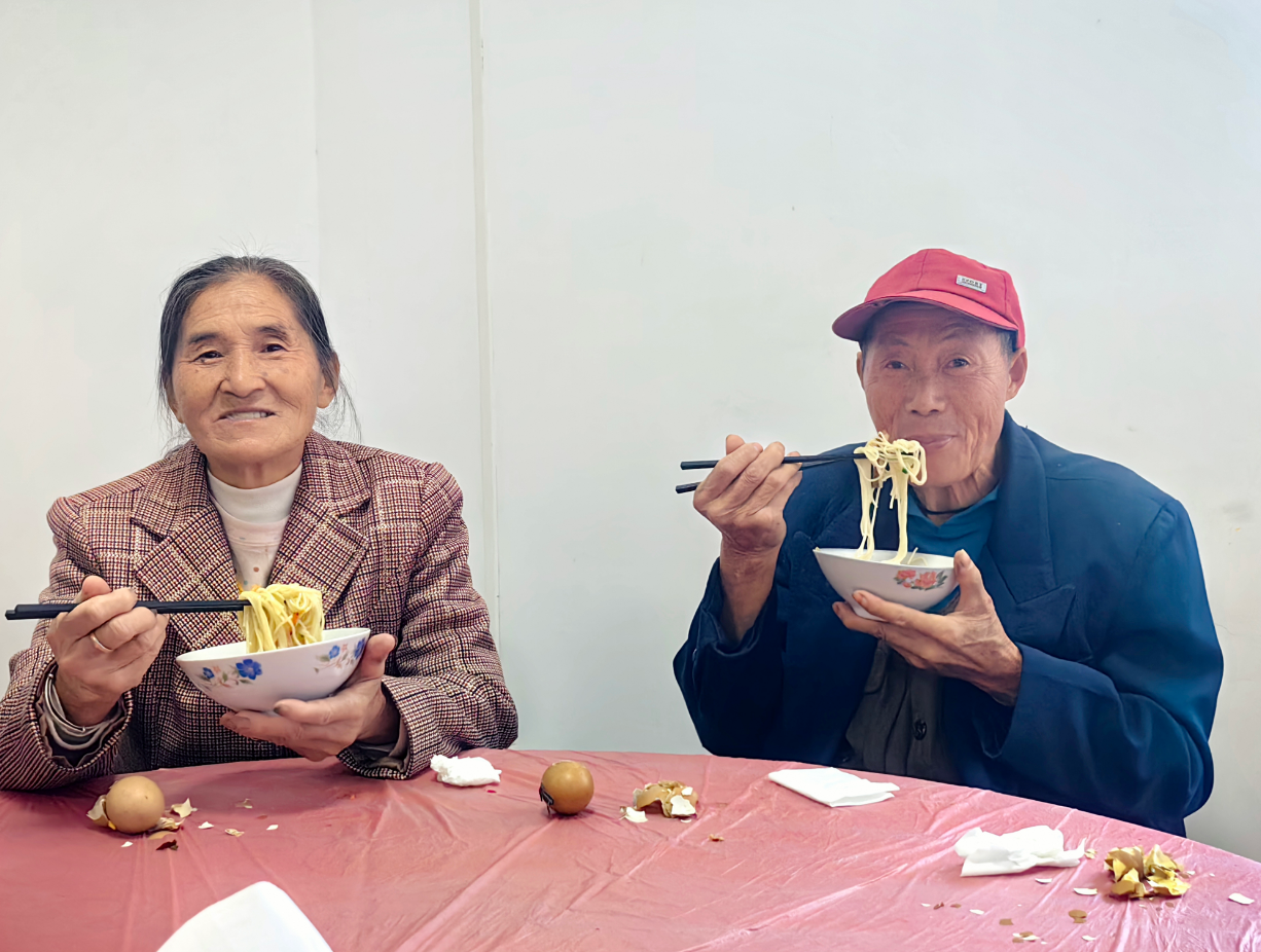 活动现场,古稔村、临川村暖意融融,处处洋溢着欢乐祥和的气息。一大早,志愿者们便忙碌起来,煮鸡蛋、煮面条、炒“浇头”,大家分工明确、配合默契,精心制作象征 “健康长寿” 的长寿面。当一碗碗热气腾腾的长寿面端到老人们手中时,大家脸上都露出了幸福的笑容,纷纷感慨 “这面条吃在嘴里,暖在心里”。