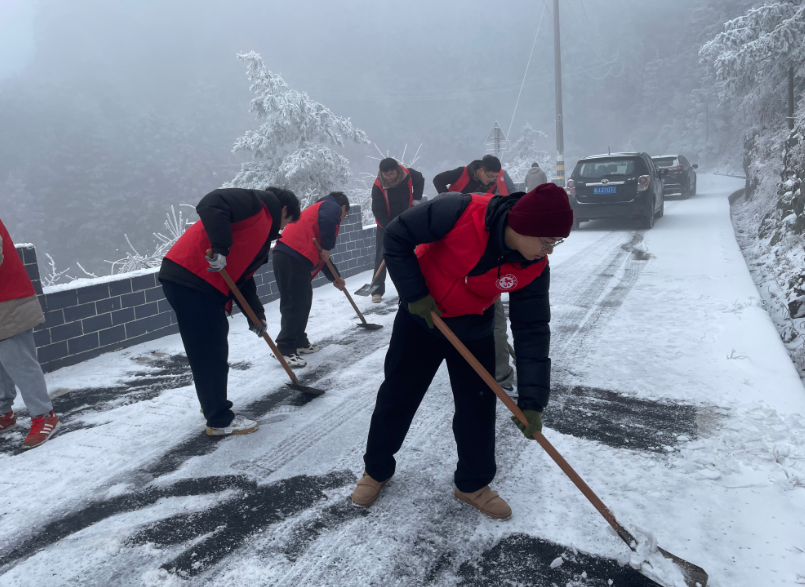 雪情就是命令,保畅就是责任。志愿者们携带铁锹、扫帚及融雪剂等工具,奔赴各主干道、急弯、陡坡等重点隐患路段。寒风凛冽,积雪深厚,但除冰现场却热火朝天。大家齐心协力,挥锹破冰,清雪除障。尽管脸庞冻得通红、手脚冰凉,汗水却早已浸湿衣衫。志愿者们不仅全力清除路障,还在危险路段设置了临时警示标志,提醒过往车辆减速慢行。那一抹抹跃动的“志愿红”,在银装素裹的山乡间显得格外醒目,成为风雪中最令人安心的风景。