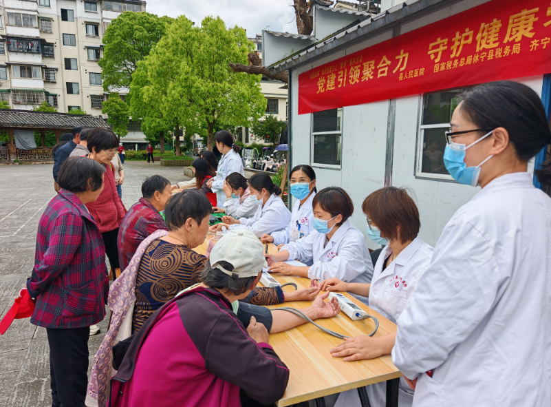 4 月 25 日,休宁县海阳镇齐宁社区联合县税务局、县人民医院、社区新时代文明实践站,在凤凰花园小区开展 “红领四季・情暖夕阳” 志愿服务活动,近百名居民踊跃参与,让便民暖心服务直达老年群众身边。
