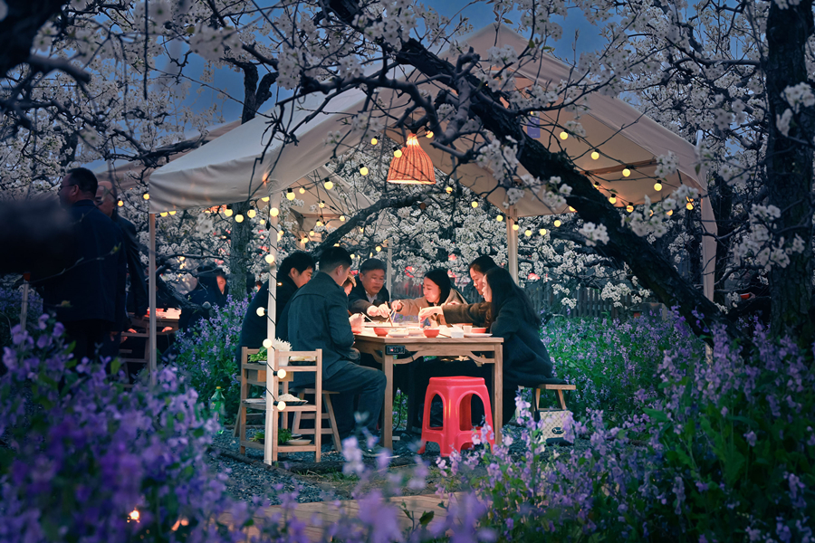 3月30日,游客在砀山县梨小萌欢乐梨园品尝梨园火锅。新华社发(崔猛 摄)