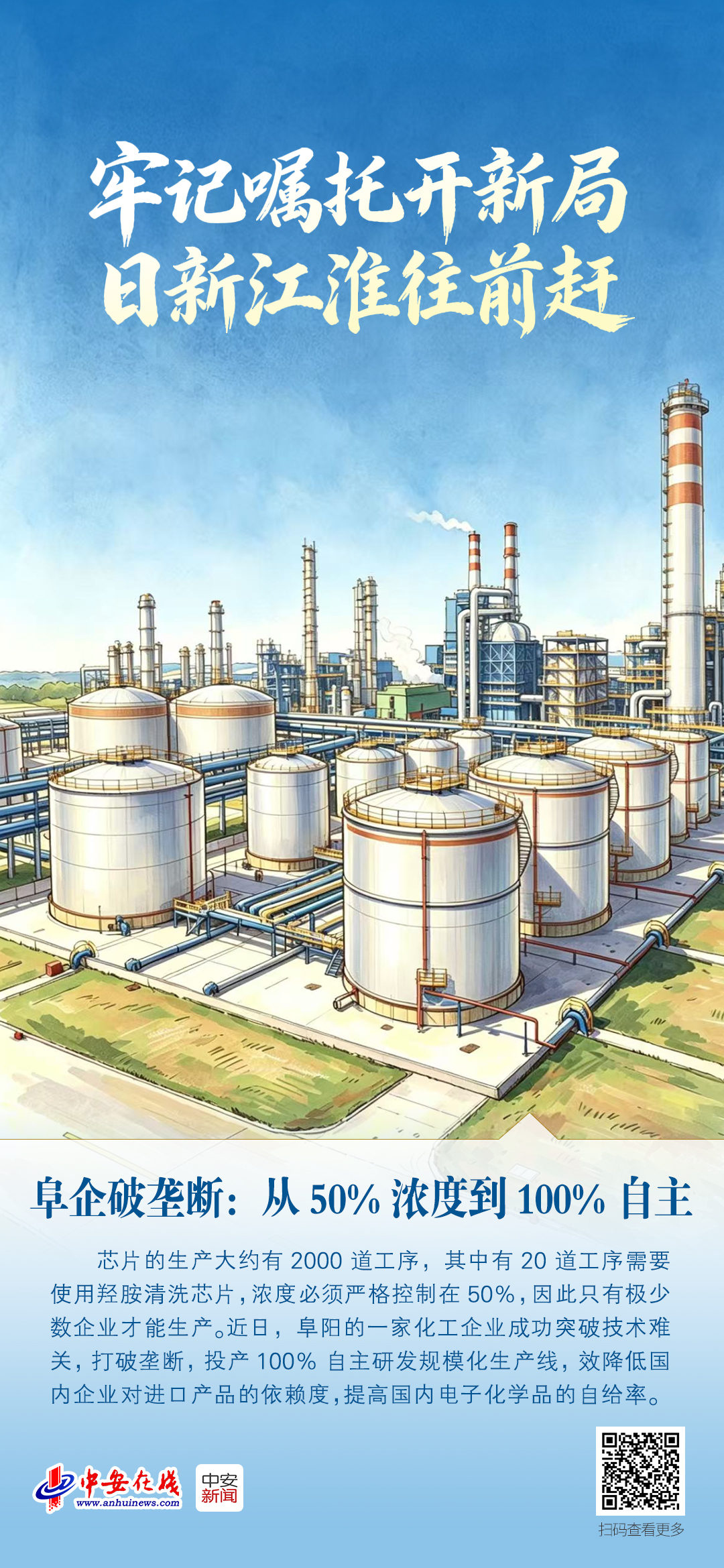 “电子级羟胺是芯片生产线里不可或缺的化学品,一旦被卡,整条产业链都可能停摆,这不仅是一个市场机会,更是捍卫我国芯片产业链安全的社会责任。”在阜阳颍东化工园区内,安徽百昊晟科技有限公司的生产车间一片忙碌。公司总经理张浩告诉记者,在记者眼前的正是国内首条50%电子级羟胺规模化生产线,它的成功投产一举打破国外长期技术垄断,为我国半导体产业补上了产业链安全的关键一环。