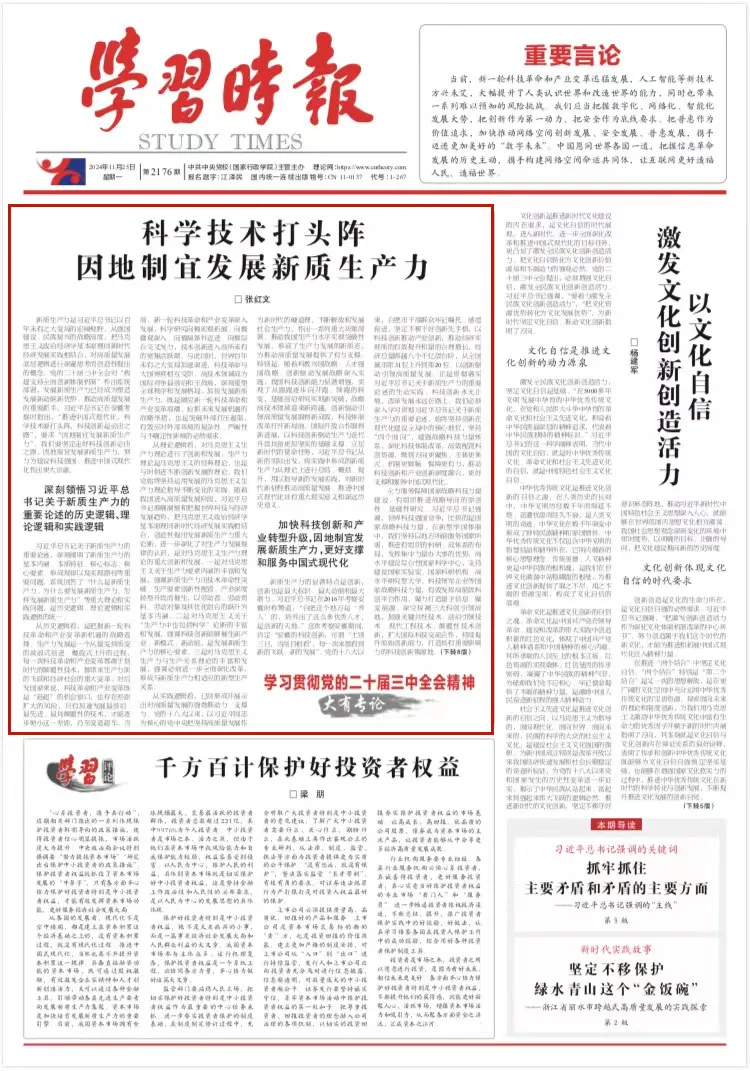 新质生产力是习近平总书记以百年未有之大变局的宏阔视野,从强国建设、民族复兴的战略高度,把马克思主义政治经济学基本原理同新时代经济发展实践相结合,对高质量发展底层逻辑进行深邃思考而创造性提出的概念。党的二十届三中全会对“构建支持全面创新体制机制”作出系统部署,发展新质生产力已经成为塑造发展新动能新优势、推动高质量发展的重要抓手。习近平总书记在安徽考察时指出,“推进中国式现代化,科学技术要打头阵,科技创新是必由之路”,要求“因地制宜发展新质生产力”。我们要坚定走好科技创新必由之路,因地制宜发展新质生产力,努力为建设科技强国、推进中国式现代化作出更大贡献。