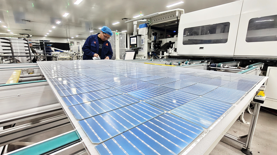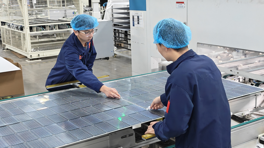 蚌埠英利新能源科技有限公司生产车间,工人正在生产光伏组件。新华网发(廖宇翔 摄)