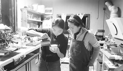 ▲ 周旋、周昭姐妹俩制作咖啡。王蓓/摄