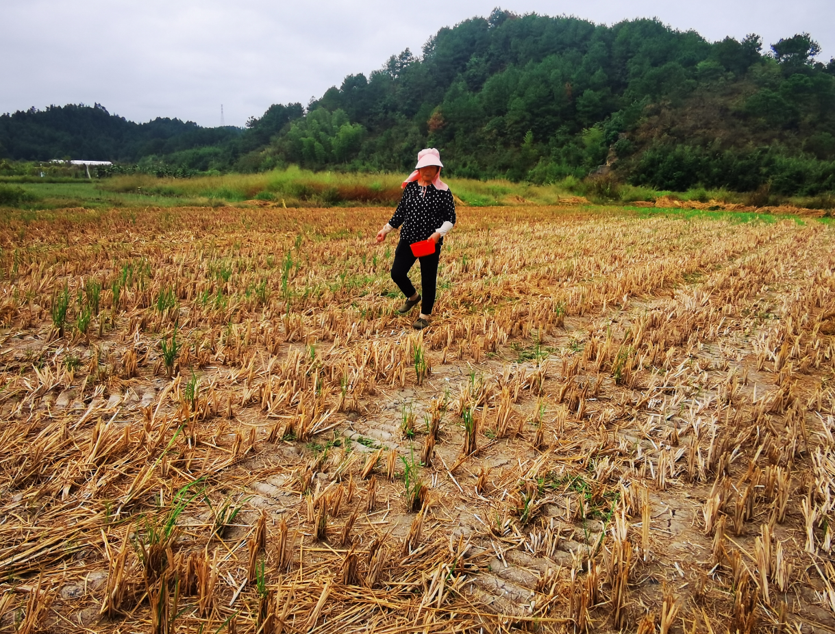 “上半年种水稻,下半年种油菜,稻谷收割了以后也不担心土地荒芜,既解决了冬季土地闲置问题,又能增加一定收入。我今年准备种植20亩油菜,并帮助周边农户代耕直播近80亩”,家庭农场主胡秀芳一边在田间撒油菜籽、硼肥、复合肥,一边介绍说。