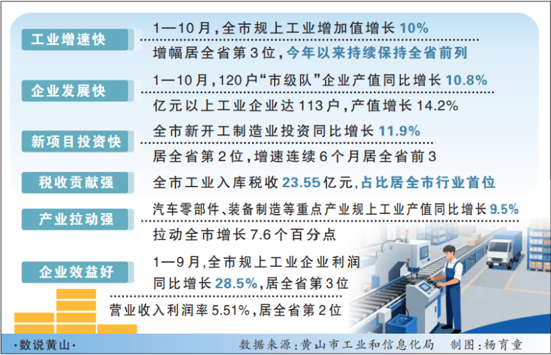 为促进工业经济高质量发展,今年以来,我市加强运行分析,完善分层分级调度机制,构建了“领导推动+部门协同+市县联动”工作格局。我市积极推进“五个一批”工作,按照“优存量、提质量、扩增量”原则,促进全市工业挖潜扩能、扩量增效,71户规模扩张企业产值增长37.6%,拉动规上总产值增长8.1%;新增入规43户,总数637户,创历史新高。在创新驱动方面,积极培育省级创新平台,累计创建省企业技术中心57家,培育省新产品107个、省“三首”产品59个,累计601户规上企业完成数字化改造,实现率94.8%;建成黄山市工业互联网平台和高新区、徽州区两个“产业大脑”平台,为企业智能化升级提供有力支撑,工业企业市场竞争力持续提升。