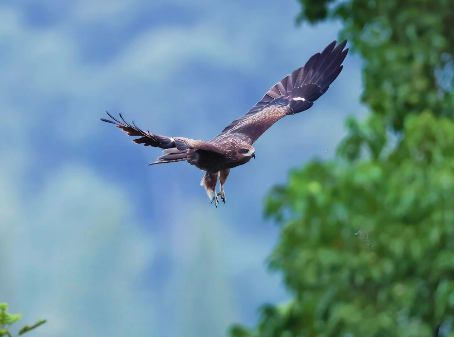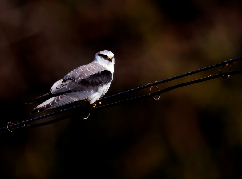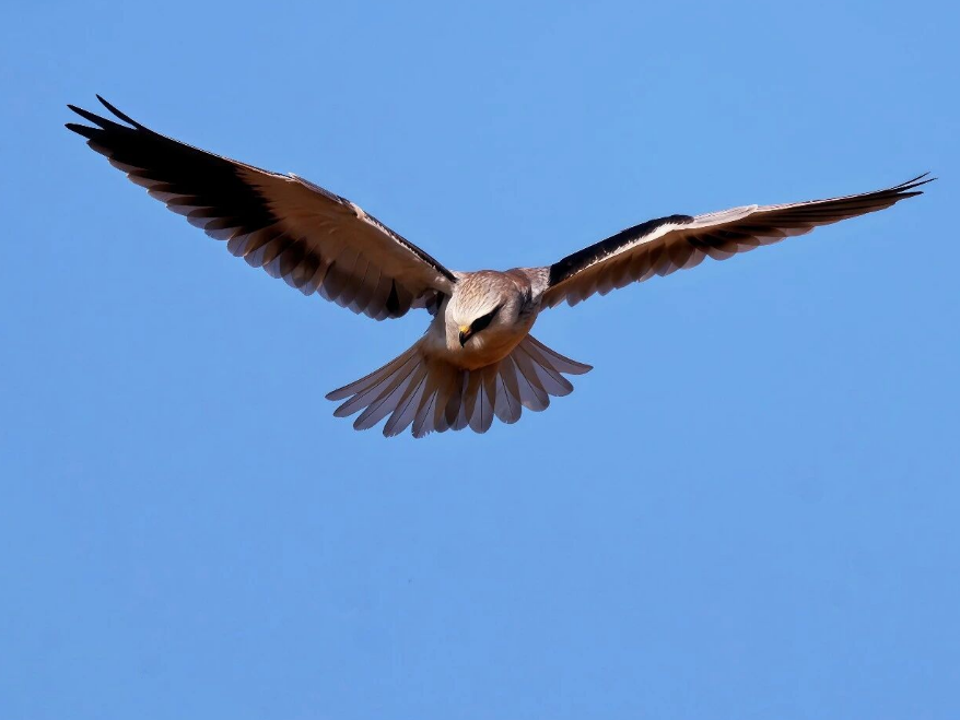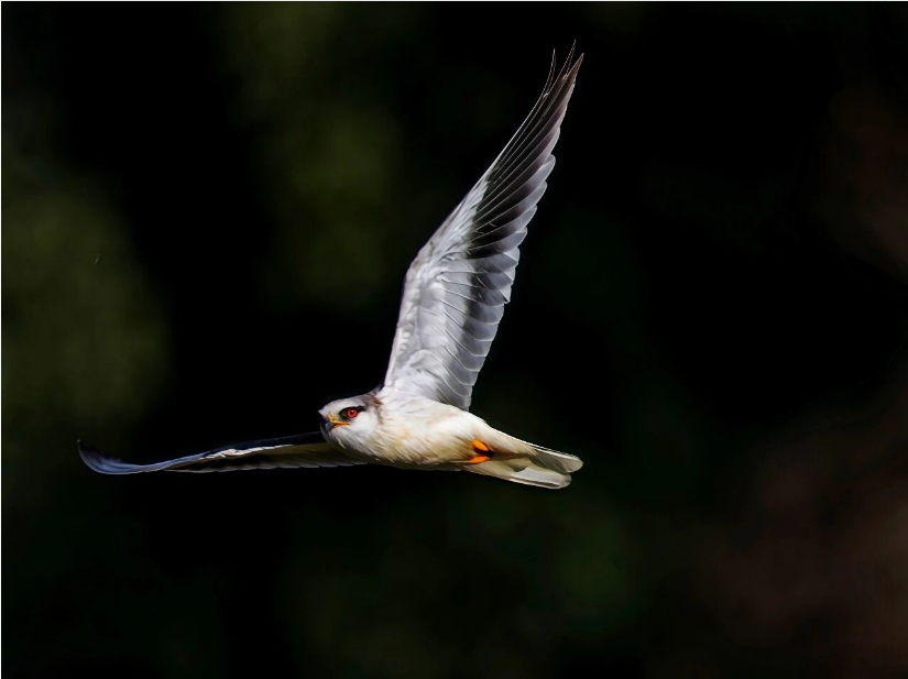 黑翅鸢属于小型猛禽,成鸟体长约30—33厘米。嘴黑色,脚黄色,虹膜红色。前额白色,到头顶逐渐变为灰色,眼周有黑斑。喉部、腹部白色,后颈、背、肩、腰,一直到尾上覆羽蓝灰色。翼中有长条状黑色斑块,翼尖黑色。具有在空中振翅悬停的特殊本领,主要以鼠类、昆虫和爬行动物为食,黑翅鸢属于国家二级重点保护动物。