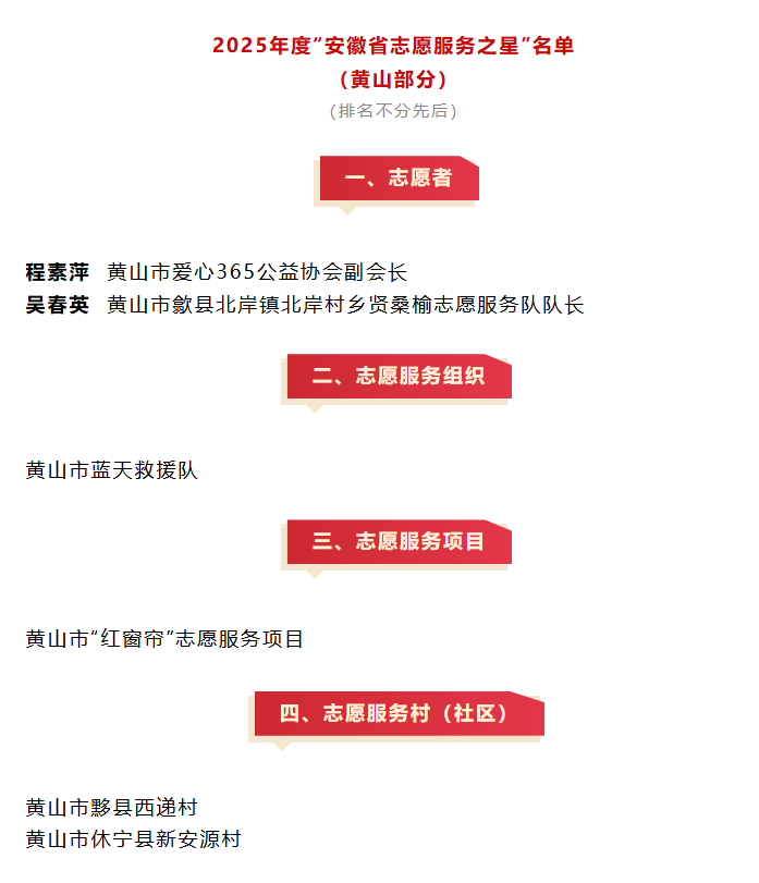 1月12日,中共安徽省委社会工作部发布公示,拟确定省委台办“皖台益佳”志愿服务队胡厚剑等20名志愿者、安徽省“江淮义警”志愿者总队等20个志愿服务组织、安徽财经大学“漠上花开”皖疆一家亲等20个志愿服务项目、合肥新站高新区站北社区等20个志愿服务村(社区),为2025年度“安徽省志愿服务之星”。具体名单如下: