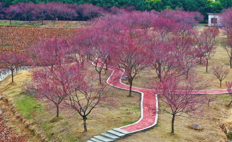 1月31日,歙县桂林镇上海练江牧场百亩梅花竞相绽放,姹紫嫣红缀满枝头,宛如一幅绚丽的田野画卷,迎接春天的到来。