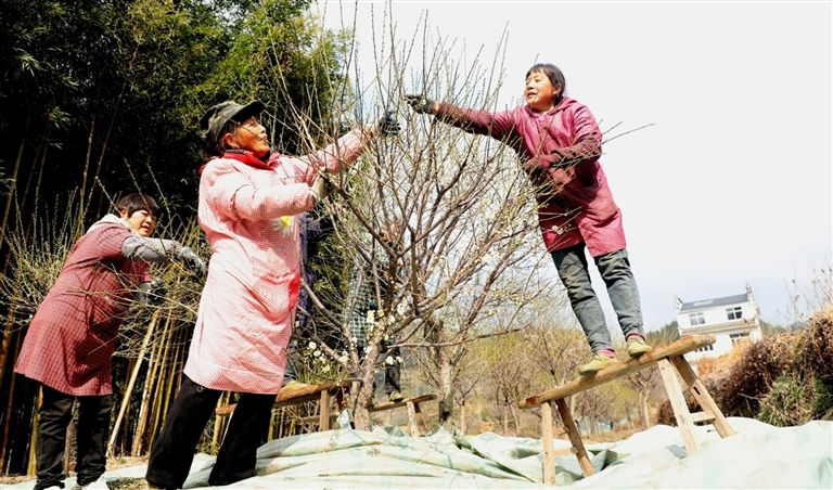 2月2日,歙县富堨镇仁里村洪秀琴家种植的40多亩绿梅进入采摘期。为了按时保质完成采摘,该户每天邀请近20名邻里姐妹帮助采摘,支付每人每天报酬100元。采摘期内,帮工村民人均可在“家门口”增收2000多元。