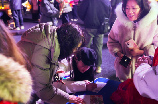 活动伊始,装扮一新的“福满状元城”公交率先登场,喜庆公交穿梭城区主干道,一路播撒年味与福气。广场入口处,福灯发放点前排起长队,鳌鱼灯、状元灯、马灯等精美手持福灯限量派送。广场一角,2026年央视春晚实时转播,精彩节目轮番上演,现场掌声、欢呼声此起彼伏。状元邮局投递箱旁,市民们执笔在明信片上写下新年心愿,或寄给未来的自己,或遥寄思念给亲人朋友,将除夕的美好期许封存在时光里。同时,活动还邀请“文小休”“武小宁”等NPC表演互动,派发状元红包,见面有礼、福气连连。