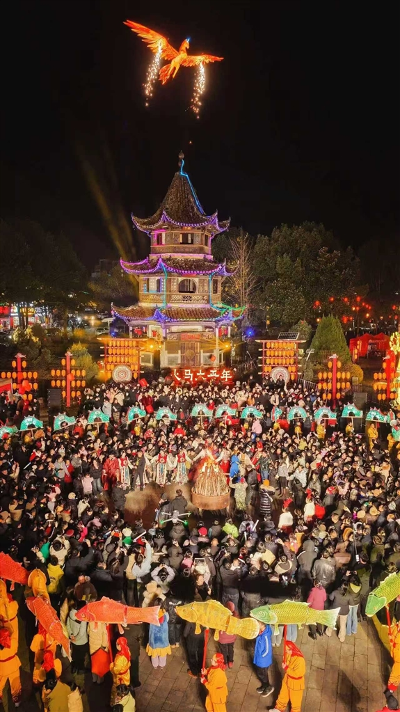 铿锵的鼓点划破长空,激昂的旋律响彻广场,龙腾马跃间,尽显新春纳祥的喜庆气象。灵动的狮舞腾跃翻转、身姿矫健,红绸翻飞间,将新春的喜庆氛围瞬间拉满,正式拉开这场民俗盛会的序幕。随着一条巨大的吉庆鱼灯出场,人群开始欢腾起来。主持人念着“摸摸鱼头,万事不愁;摸摸鱼身,幸福一生”。吉庆鱼灯成了宠儿,大家在欢声笑语中触摸非遗温度、感受民俗魅力。