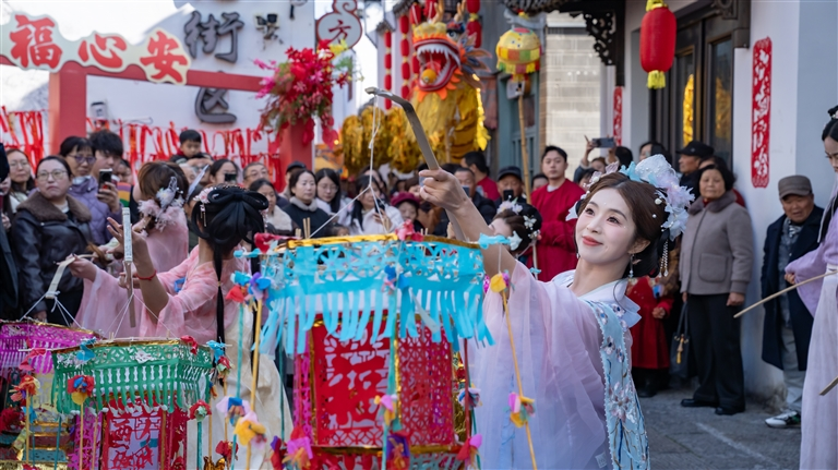 10时许,祁门县东街历史文化街区已是人头攒动、锣鼓喧天。一盏盏造型精美的走马灯在舞动中轮轴转动,光影流转,灯上“福”“马”字等吉祥图案,寓意新的一年马到成功、福气满满。表演队伍穿行于古街巷陌,引得游客纷纷驻足拍照,喝彩声此起彼伏。