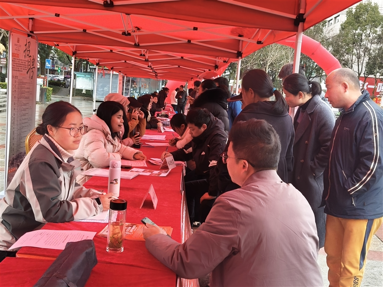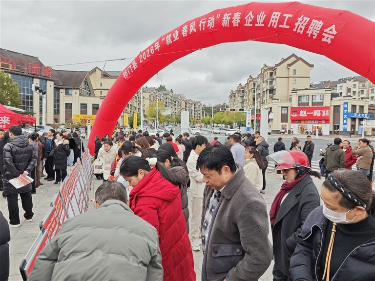 2月24日,祁门县新城区水云居广场人头攒动。当天,以“春风送岗促就业 精准服务惠民生”为主题的2026年“就业春风行动”大型新春企业用工招聘会在这里举办,引来众多应聘者。