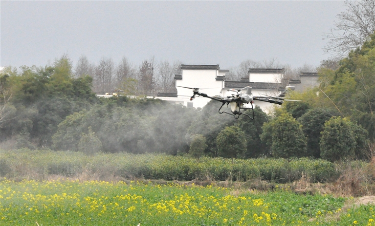3月3日,黟县碧阳镇农民利用无人机飞防作业,管控油菜花田,通过精准补肥与施药,确保油菜稳产增收。