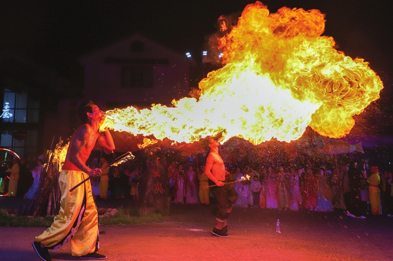4月4日晚,在黄山区芙蓉谷景区“芙蓉篝火夜”上,佤族表演者正在展示喷火技艺。程琦晗/摄