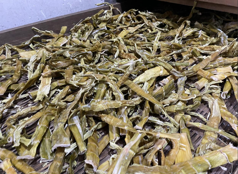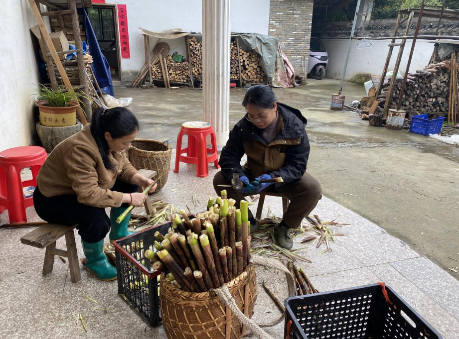 春笋鲜嫩易腐,依托传统工艺制成笋干,既能延长食材保鲜期,又能大幅提升农产品附加值。“好竹连山觉笋香”,在四村村村民家中的笋干加工,大家分工协作、有条不紊,去老根、剥笋壳、清水漂洗,处理干净的鲜笋整齐码放,再经蒸煮、腌制、炭火烘烤等多道古法工序,最大程度保留竹笋的紧实口感与原生鲜香。