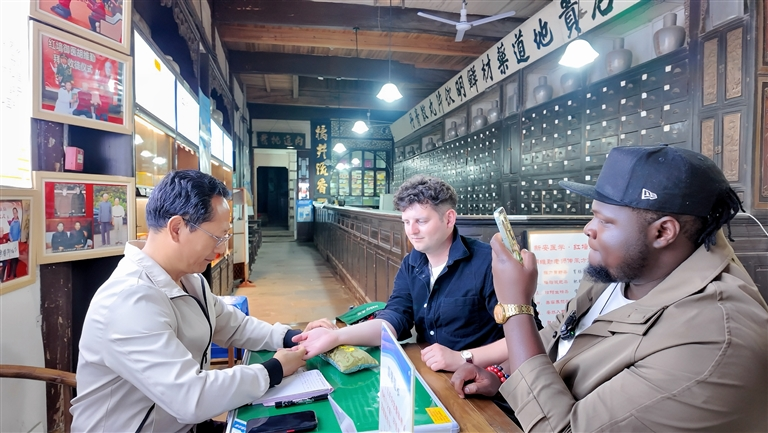 4月20日,网红博主一行走进屯溪老街,在老街烟火中触摸徽州文脉肌理。图为博主体验中医诊脉,了解学习传统中医养生知识。 程 晔/摄