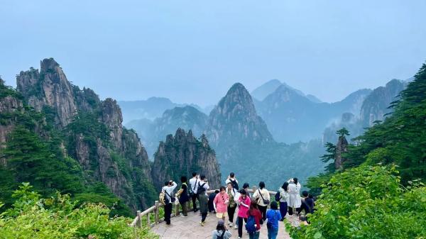 6月22日,端午节,黄山风景区天气晴朗,群峰挺拔秀丽,处处洋溢着节日的氛围,绝美的风光和多彩的民俗活动吸引了众多游客来山游玩。